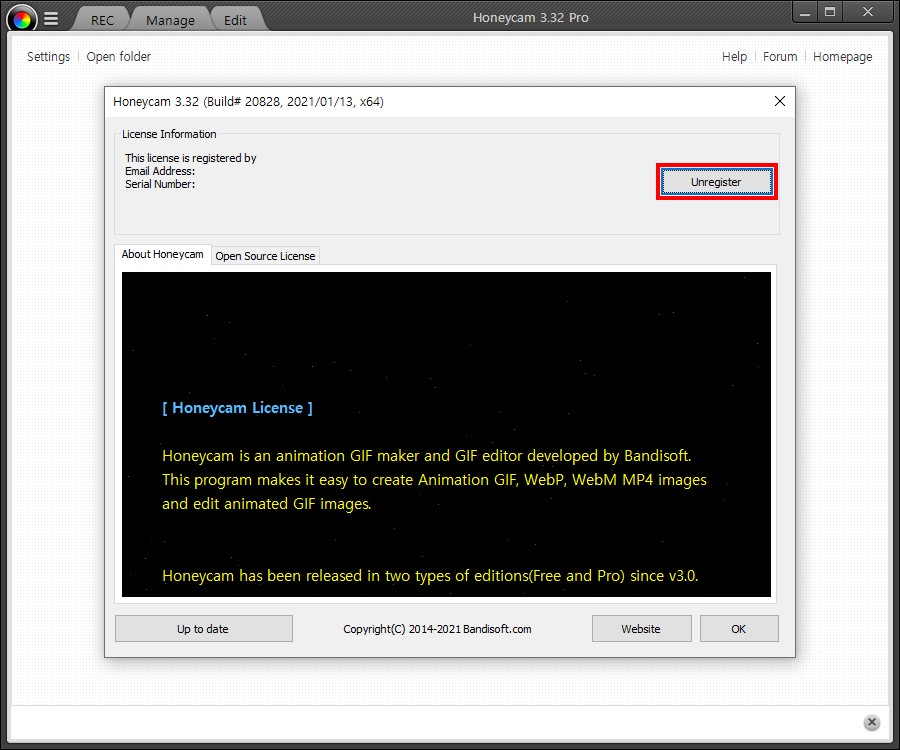 • Run Honeycam. Press F1 key to open the About window, and then click the Unregister on the right side.